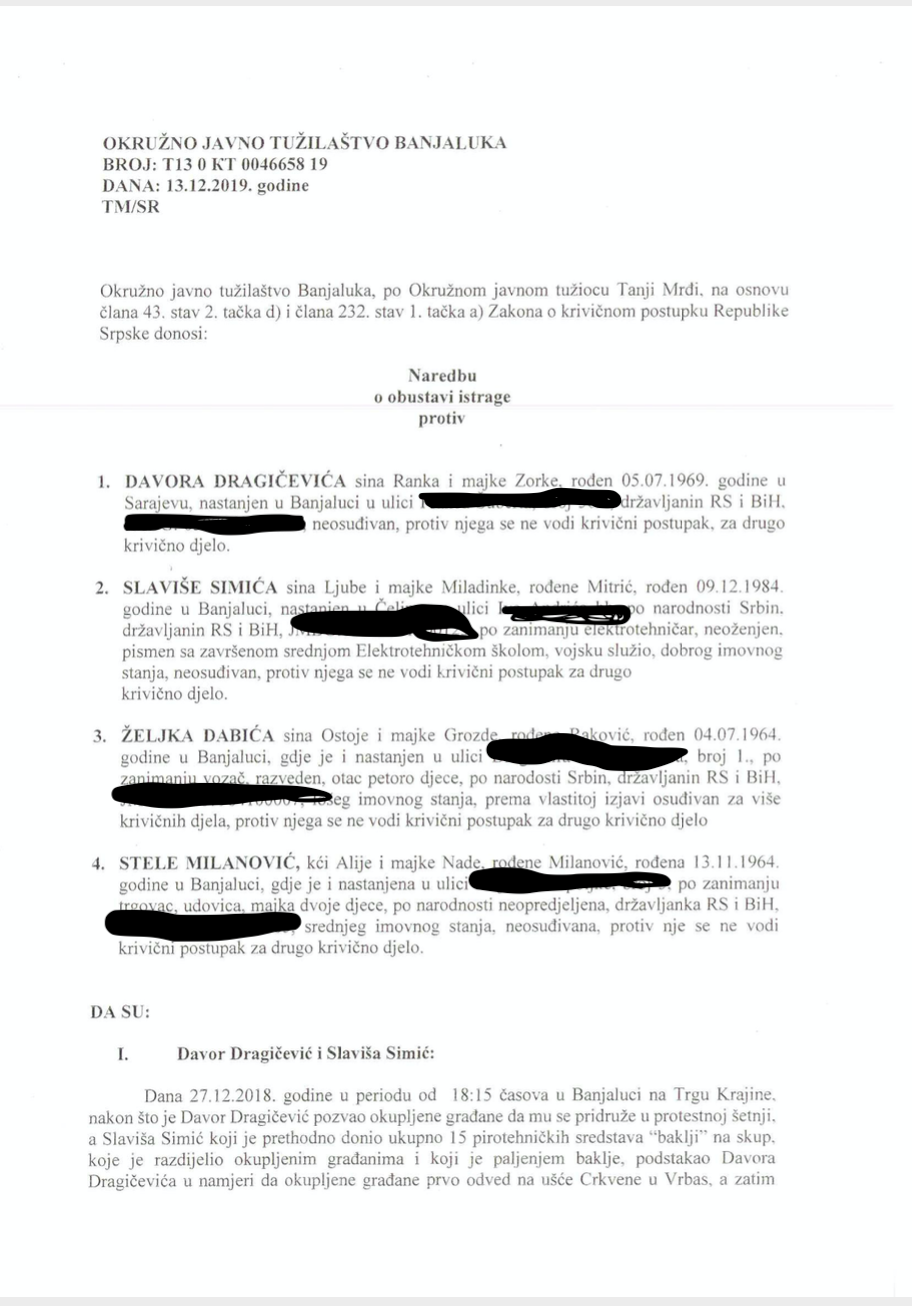 Okružno javno tužilaštvo Banjaluka donijelo je, 13.12.2019., Naredbu o obustavi istrage protiv Davora Dragičevića, Slaviše Simića, Željka Dabića i Stele Milanović.