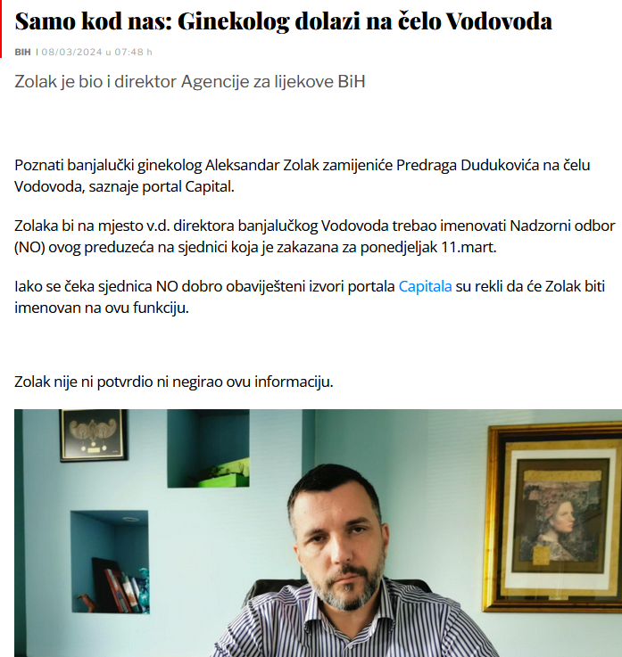 Nakon što je Duduković u strahu od krivičnog gonjenja podnio ostavku na mjesto direktora „Vodovoda“, Stanivuković je našao tupana koji je spreman da stavi svoj potpis na ugovor o prodaju zemljišta Jarćima. Radi se o Aleksandru Zolaku, kojeg je Stanivuković postavio na mjesto direktora pomenutog preduzeća. Zolak je inače po struci ginekolog.
